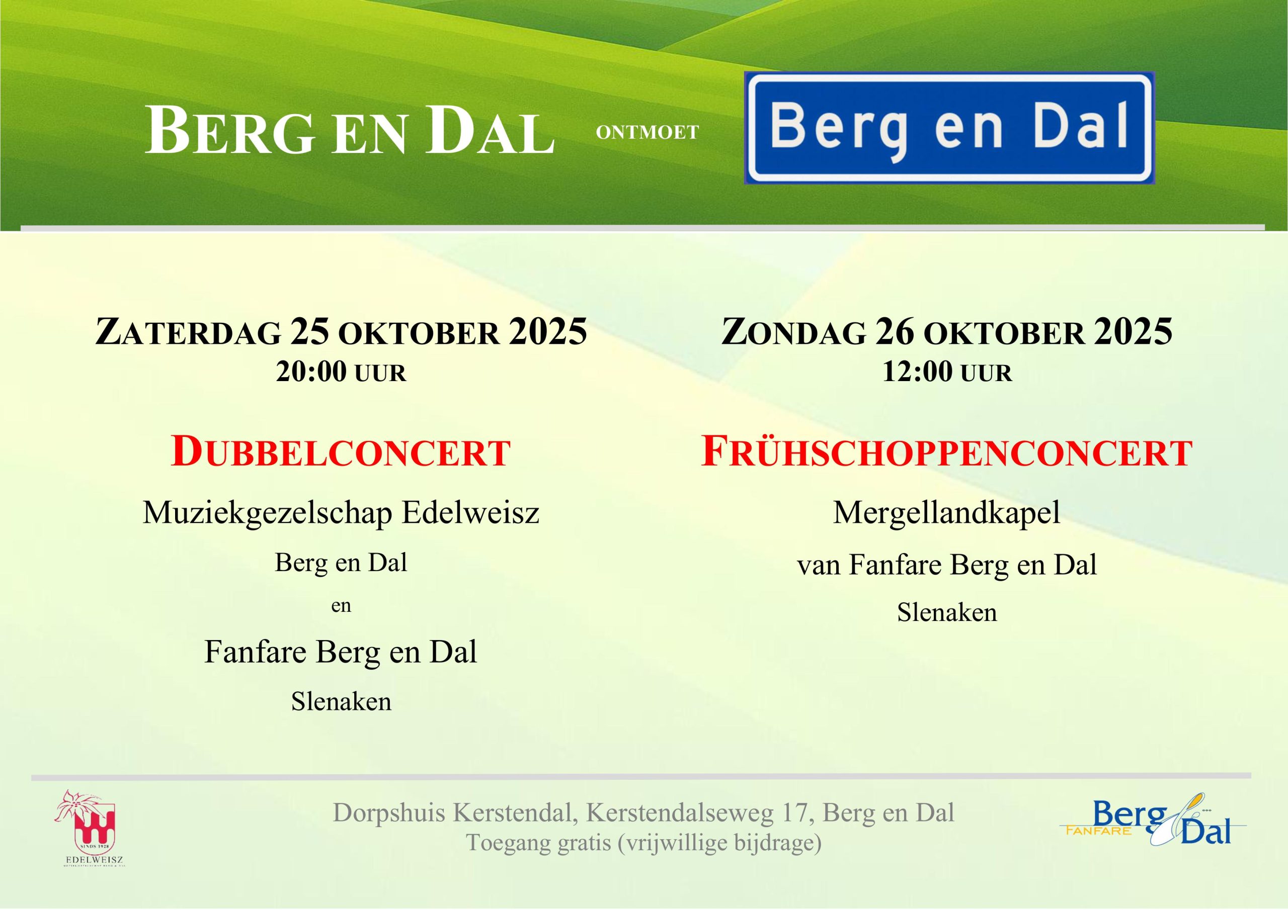 DUBBEL CONCERT : Muziekgezelschap Edelweisz met Fanfare Berg en Dal uit Slenaken | 25-10-2025 | Meer informatie |
